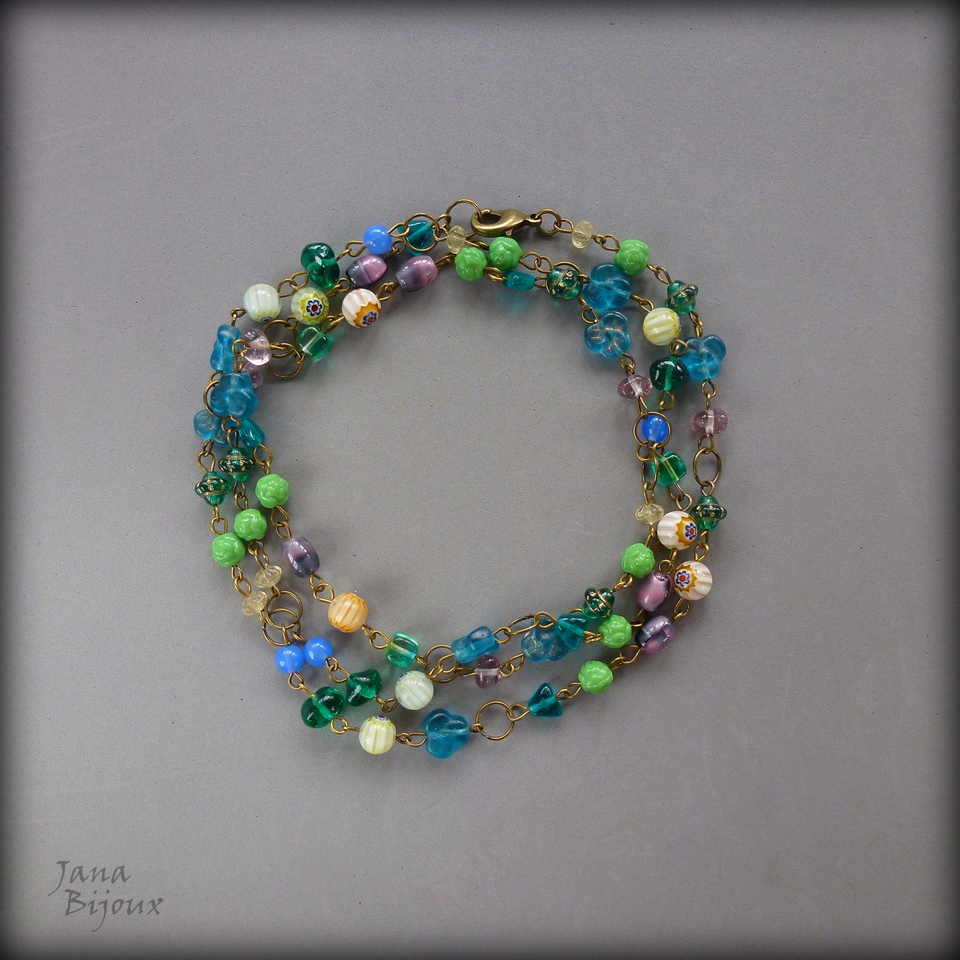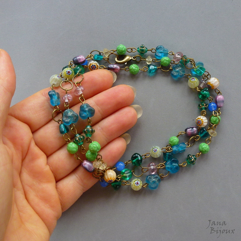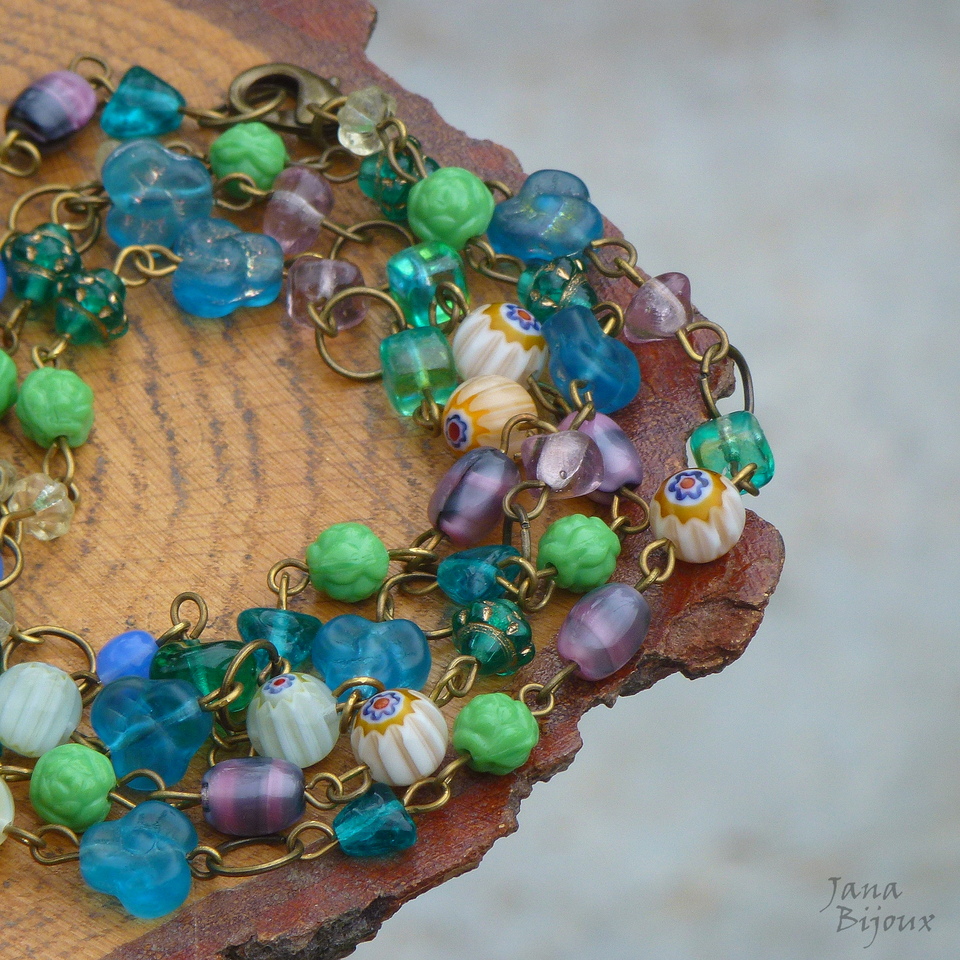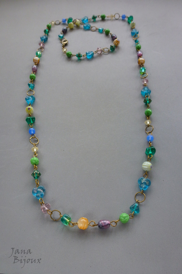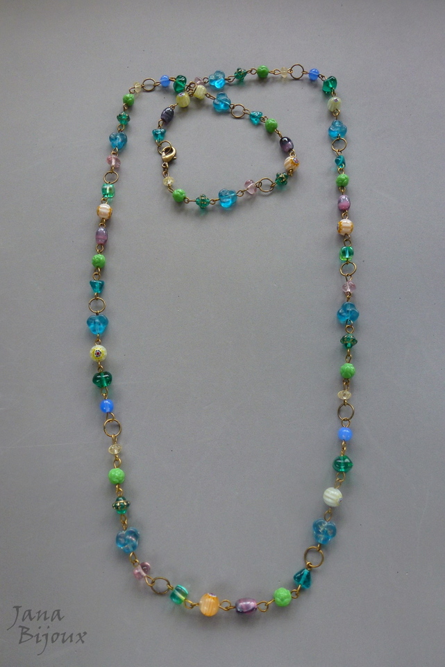 Colar comprido 96 cm, delicado, com vidro importado da República Tcheca e millefiori italiano, em tons de verde, azuis, amarelo e lilás, componentes ouro velho.. e argolas.  De R$ 52,00 por R$ 39,00 (-25%)
