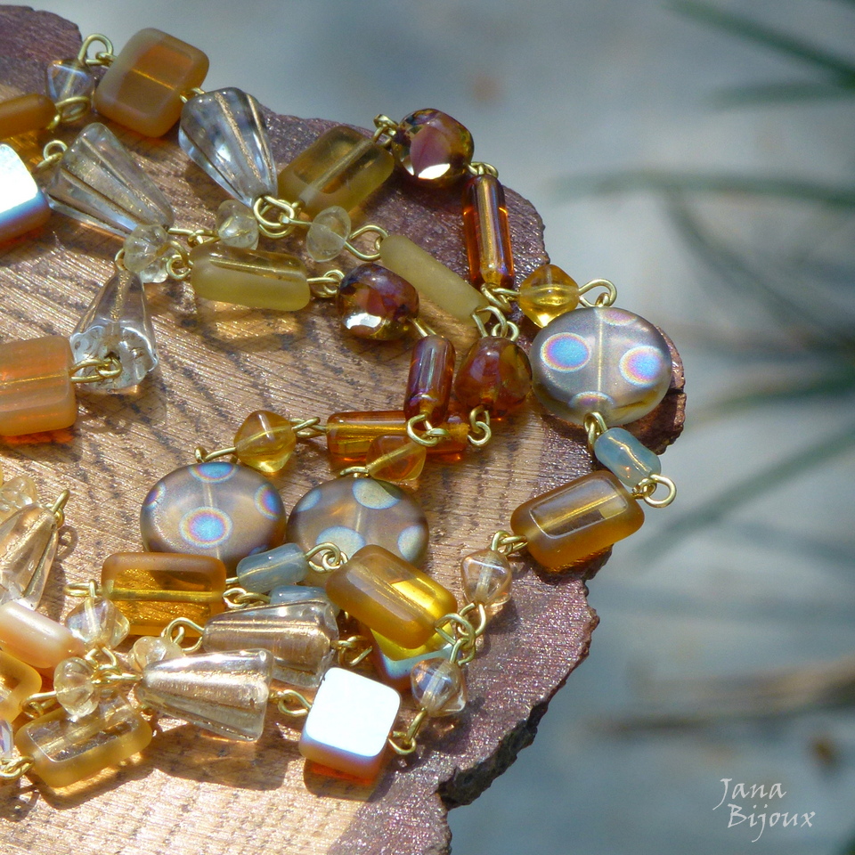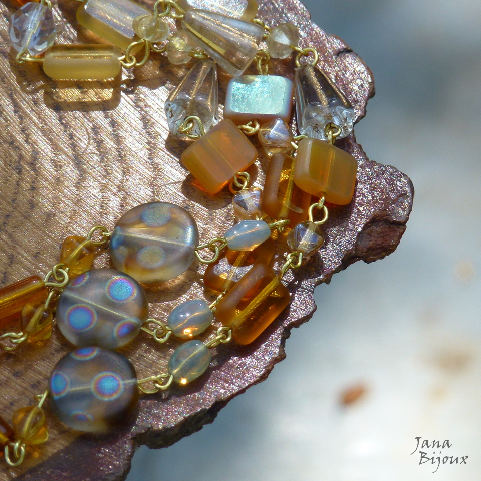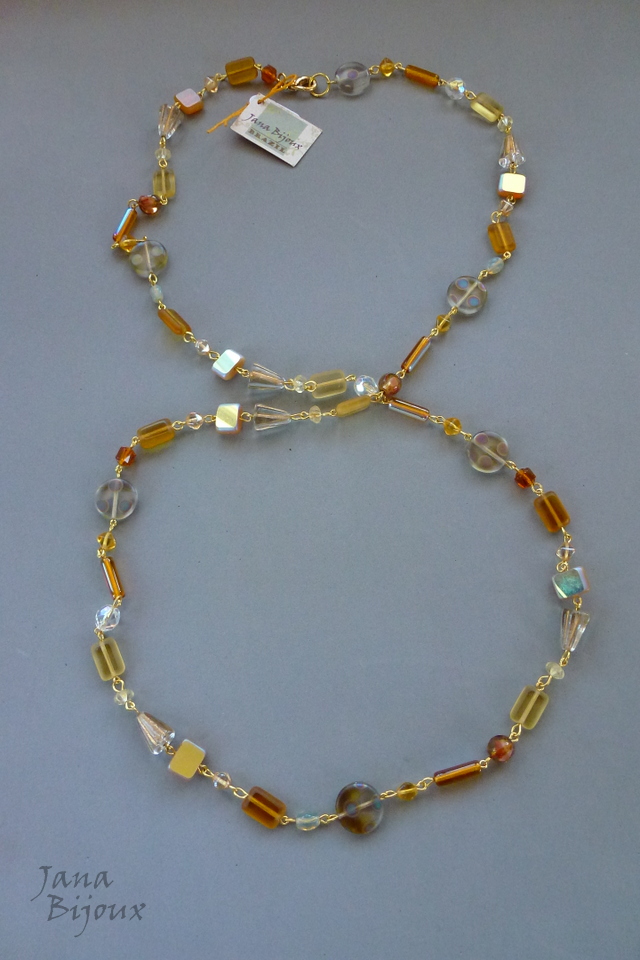 Colar comprido 99 cm, de cristais luxuosos, importados, alguns com efeito espelhado, de tons de ambar, amarelos, componentes dourados, pode ser usado como curto de duas voltas. R$ 59,90