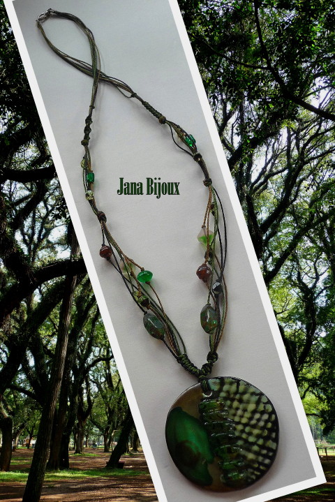 c409 08/05/2010VENDIDOS ( Prodáno)Jana Bijoux Colar comprido com a colagem de vidro na porcelana, macramé e vidro. DLOUHÝ NÁHRDELNÍK S PORCELÁNOVÝM MEDAILÓNEM S KOLÁŽÍ SKLA, MAKRAMÉ A SKLO.