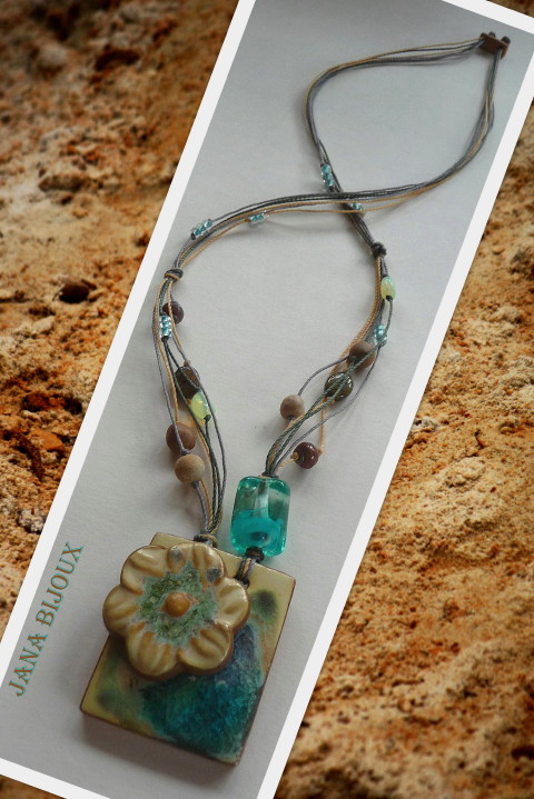 ASYMETRICKÝ, DLOUHÝ NÁHRDELNÍK  BEZ JAKÉHOKOLIV KOVU, S KERAMIKOU S ROZTAVENÝM SKLEM A KOLÁŽÍ.