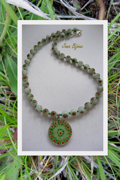 KRÁTKÝ NÁHRDELNÍK Z MILLEFIORI A POSTŘÍBŘENÝCH KOVODÍLŮ.