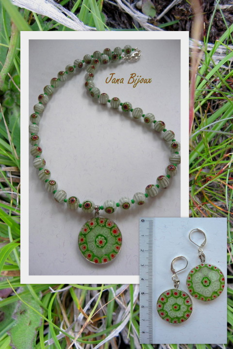 Colar curto de millefiori com pingente e componentes banhados à prata. Brincos b197 banhados .