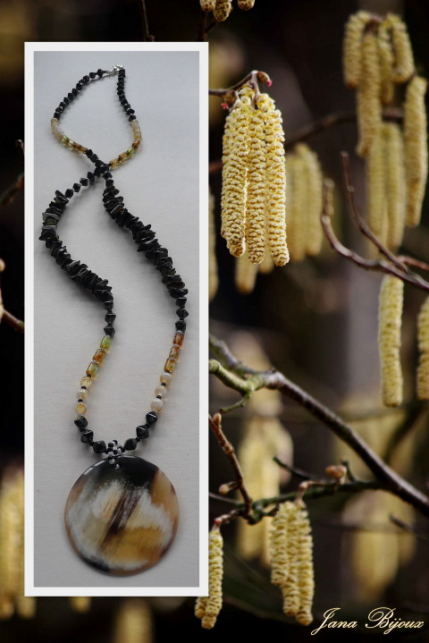 c426 24/05/2010VENDIDOS ( Prodáno)Jana Bijoux Colar comprido de vidro com pingente de chifre e cascalho de madrepérola preto. DLOUHÝ NÁHRDELNÍK ZE SKLA S PŘÍVĚŠKEM Z ROHOVINY A SE ZLOMKY ČERNÉ PERLETĚ .