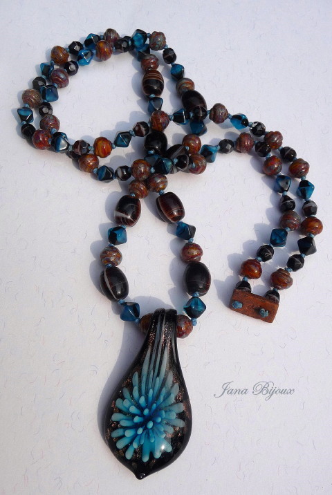 DLOUHÝ NÁHRDELNÍK BEZ JAKÉHOKOLIV KOVU,  S RUČNĚ DĚLANÝM PŘÍVĚŠKEM, SKLEM A UZLY.