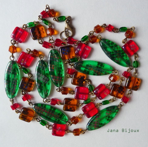 Colar comprido com arames em ouro envelhecido e vidro de cores contrastantes (peças verdes medem 3 cm cada e peças menores quadradas 1 cm) .