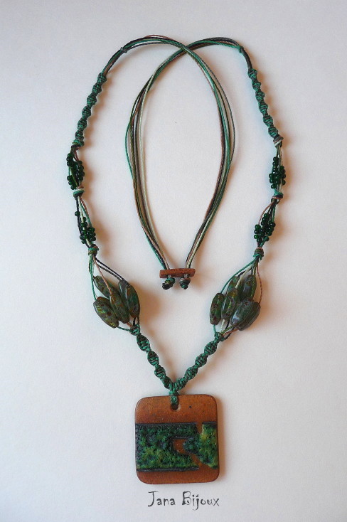 DLOUHÝ NÁHRDELNÍK BEZ JAKÉHOKOLIV KOVU S KERAMIKOU, SKLEM, A MAKRAMÉ.