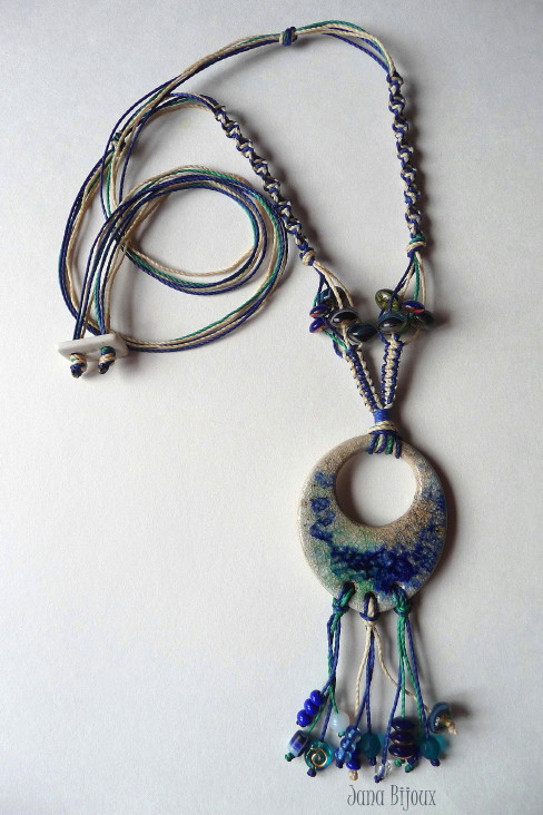 Colar com macramé, vidro, cerâmica e sem metal algum R$ 25,00.