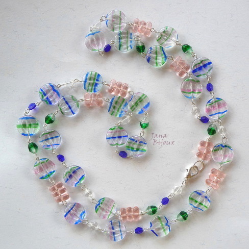 Colar comprido de componentes banhados à prata e vidro R$ 42,00.