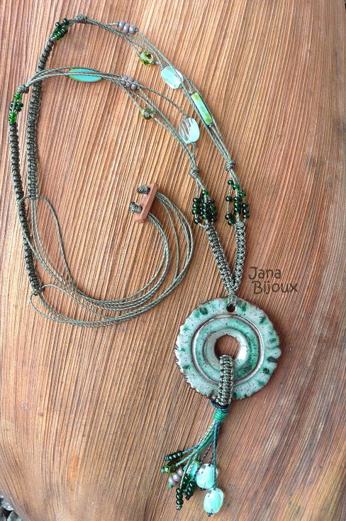 Colar comprido de cerâmica, vidro e macramé, sem metal algum R$ 34,00.
