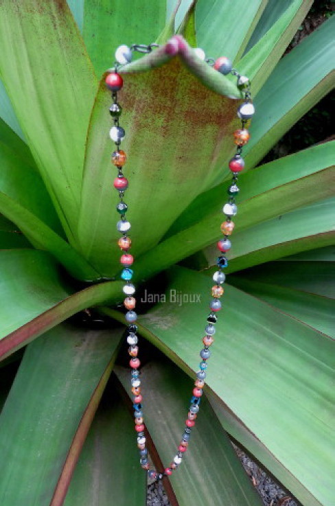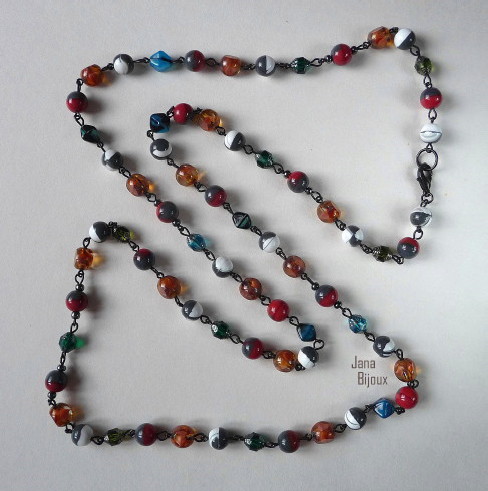 Colar comprido com componentes banhados à zinco prato diversos vidros R$ 36,00.