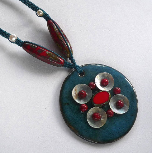 Medailón je velký 6 cm, jsou na něm nalepeny speciálním lepidlem čtyři mušličky (každá měří 1,5 cm) a recy sklo.