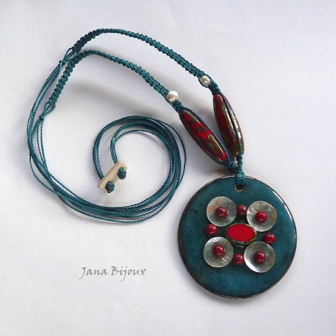 Náhrdelník je z voskových nití, má 78 cm bez medailónu, zakončen je keramickým obdelníčkem s iniciály JB a zatavenými uzly. Jeho délka se dá lehce zkrátit až o 46 cm tak, že uzlíky povytáhneme z koncového obdelníčku.