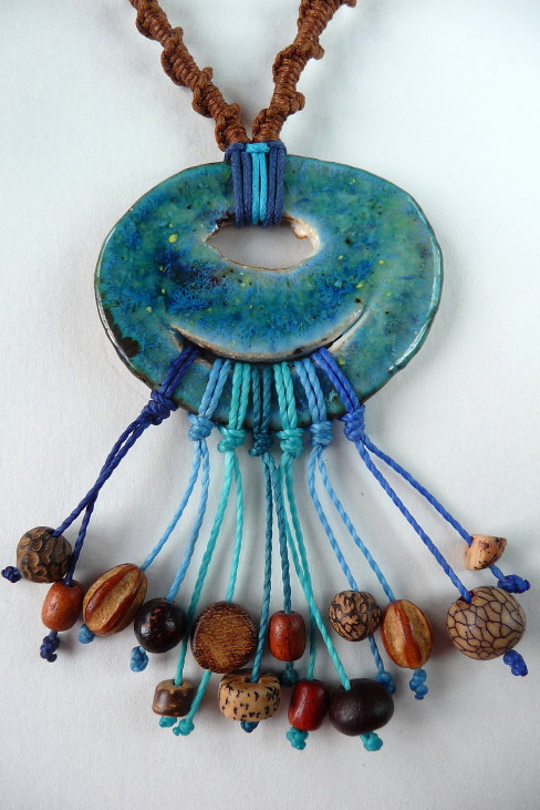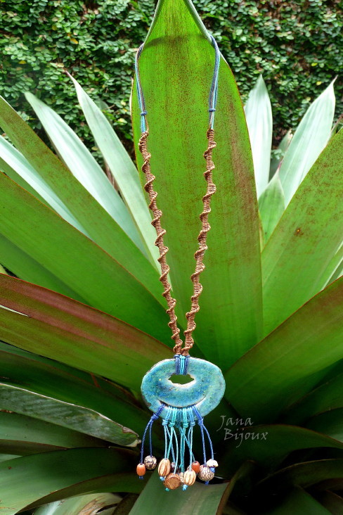 Colar curto com medalhão de cerâmica com linda esmaltação azul, vitrificada, sementes e macramé. O medalhão tem 5 cm de largura e 4,5 cm altura e penduricalho de 4 tons de azul tem 4,5 cm tmb. O colar tem em volta 43 cm. R$ 32,00.
