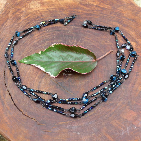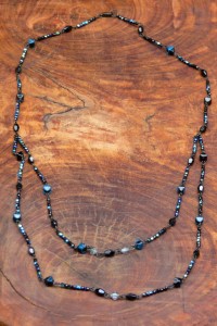 c536 20/03/2011VENDIDOS ( Prodáno)Jana Bijoux Colar comprido, chique, com duas voltas na frente, delicado com vidro preto com brilho azul furta-cor, com componenetes banhados à zinco preto R$ 38,00.
