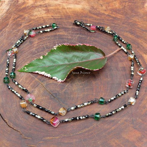 c538 20/03/2011VENDIDOS ( Prodáno)Jana Bijoux Quinto dos colares de vidro preto com brilho metálico, colar comprido, delicado e chique, com vidro que brilha em tom dourado claro + vidro colorido. Colar é feito com componenetes banhados à zinco preto R$ 36,00.