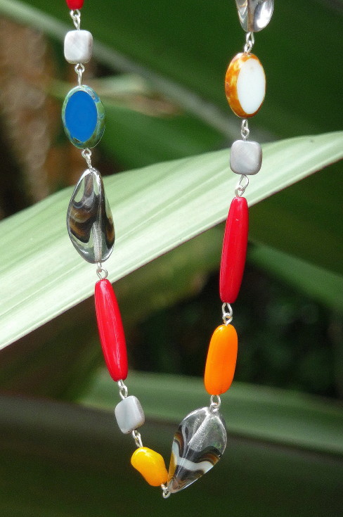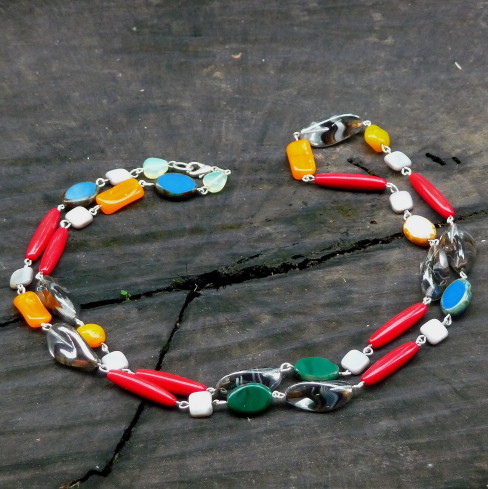 Colar comprido colorido de vidro nobre, madrepérola e componentes banhados à prata R$ 42,00.