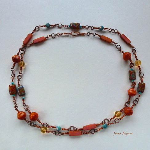 DLOUHÝ NÁHRDELNÍK ZE SKLA, MĚDĚNÉHO DRÁTU TOČENÉHO V RUCE A KROUŽKŮ.