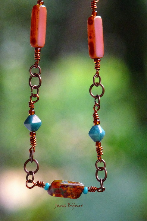 Colar comprido feito com arames de cobre, torcidos a mão, argolas e vidro R$ 42,00.