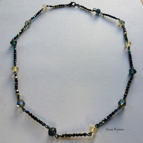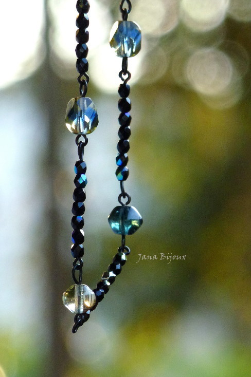 c579 26/07/2011VENDIDOS ( Prodáno)Jana Bijoux Último dos vidro pretos com brilho, colar curto com brilho metálico, delicado e chique, com vidro que brilha em tom dourado claro e azul furta-cor. Colar é feito com componenetes banhados à zinco preto R$ 28,00.