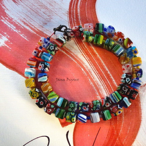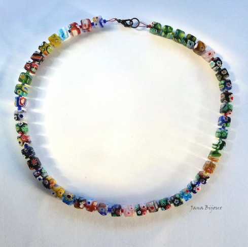 c594 07/08/2011VENDIDOS ( Prodáno)Jana Bijoux Colar curto com cubos de millefiori e fecho de componentes banhados à zinco preto R$ 36,00. (comprimento 47,5 cm) KRÁTKÝ NÁHRDLENÍK Z KOSTEK MILLEFIORI.
