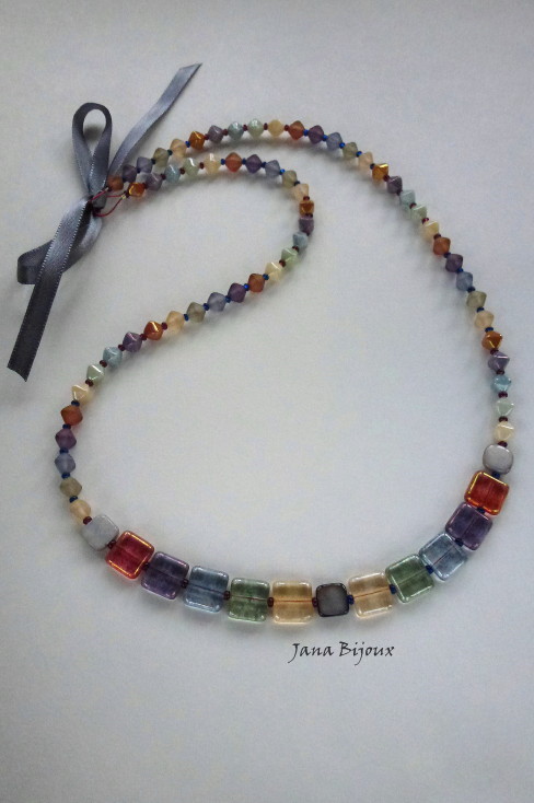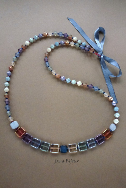 c596 10/08/2011VENDIDOS ( Prodáno)Jana Bijoux Lindo colar médio (59 cm) com vidro em três tipos de vidros da mesma família, em tons pastéis , transparente e fosco + 3 pç. de madrepérola tingida. Fecho de fita ( mas pode ser substituido pelo fecho normal) R$ 34,00.