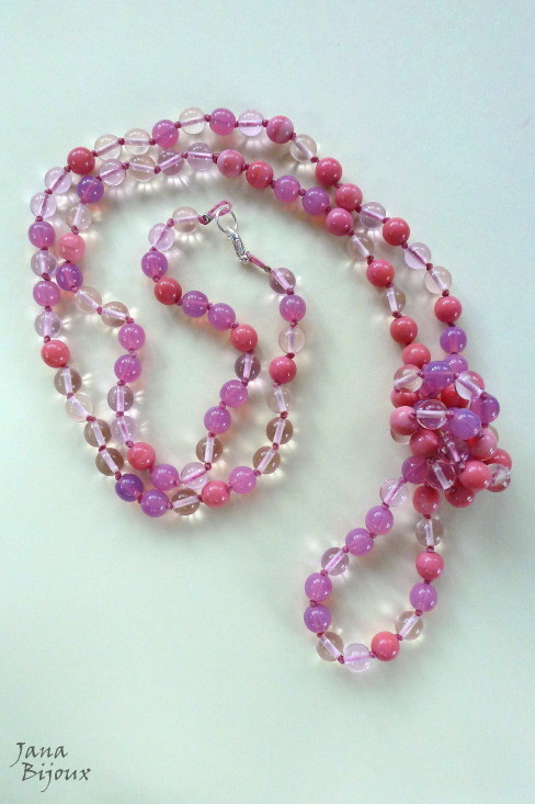 Colar super comprido (110 cm) para se usar com nó, feito de vidro em vários tons de rosa e transparente, acabamento banhado à prata, nós entre cada bolinha de vidro. R$ 42,00