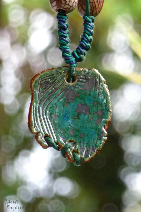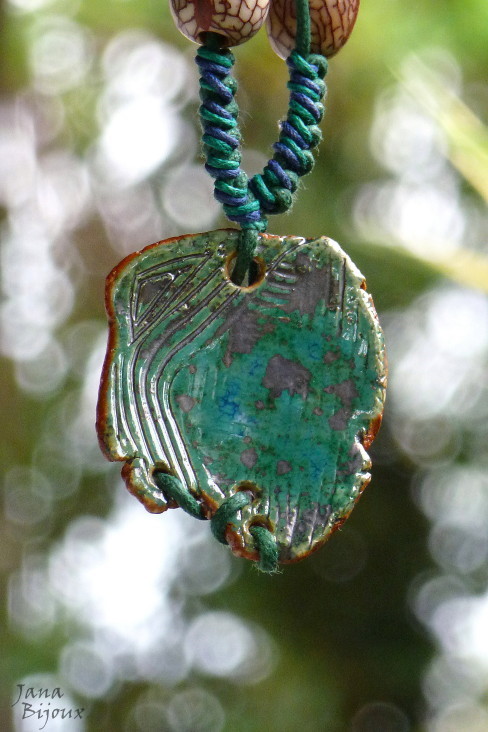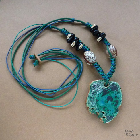 Náhrdleník nemá na sobě žádný kov, je zakončen keramikou s iniciály JB a uzly.