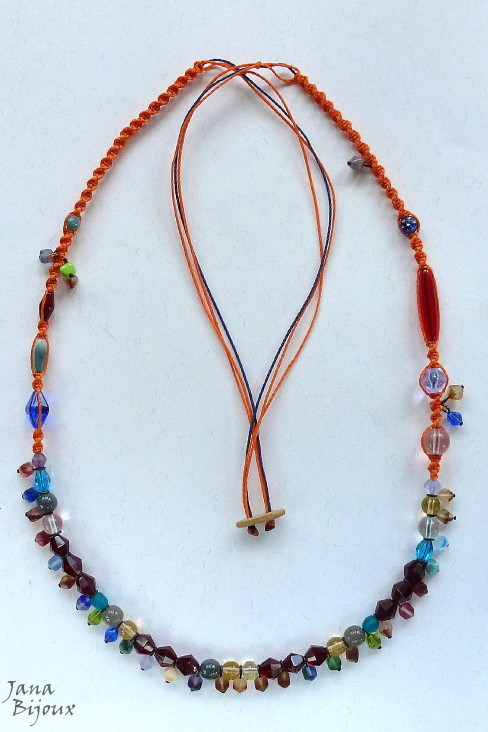 c683 03/02/2012VENDIDOS ( Prodáno)Jana Bijoux Colar comprido 94 cm, com fio azul e laranja, vidro colorido, macramé e acabamento em cerâmica com iniciais JB e comprimento ajustável. DLOHÝ NÁHRDELNÍK S BORDOVOU VOSK. NITÍ , SKLEM, UZLY A PROCELÁNOVÝM ZAKONČENÍM. DÉLKA JE UPRAVITELNÁ.