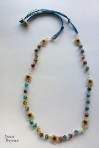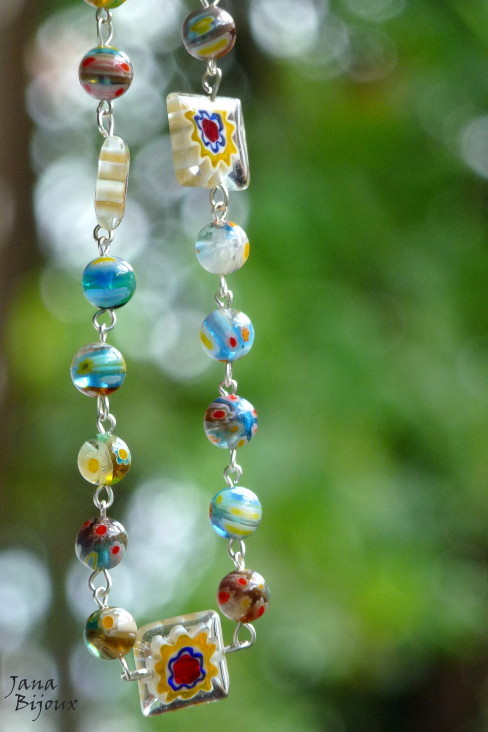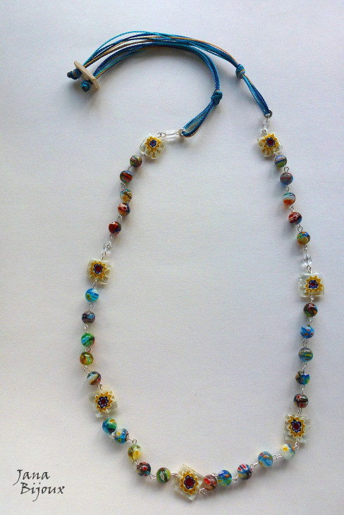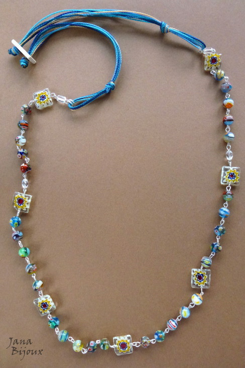 c702 14/03/2012VENDIDOS ( Prodáno)Jana Bijoux Colar comprido de millefiori e fios em tons azuis. Comprimento 90 cm, mas é ajustável. Acabamento em cerâmica com iniciais JB, metal banhaado à prata R$ 42,00. Italské sklo a barevné nitě.