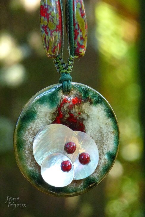 Colar comprido com a cerâmica e a colagem de conchas e vidro reciclado, nas laterais peças grandes de vidro (cada um tem 4 cm) e arames importados torcidos a mão e macramé. Comprimento do colar é 81 cm sem o medalhão, mas é ajustável, acabamento em cerâmica com iniciais JB. O medalhão tem 6 cm. R$ 38,00  Fios em 3 tons de verde.