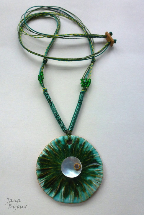 DLOUHÝ NÁHRDLENÍK S KERAMIKOU, MUŠLOVINOU, ZELENÝM DOVOZOVÝM DRÁTEM A VOSK. NITĚMI.