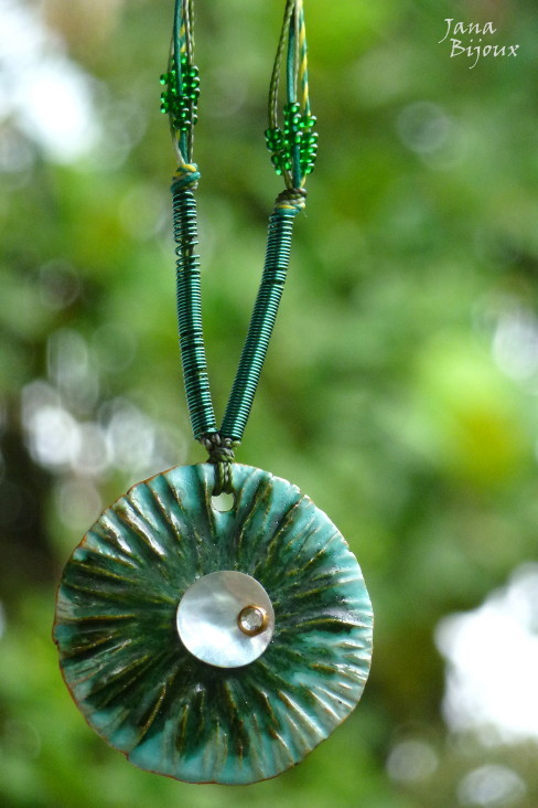 Colar comprido de cerâmica com a colagem de concha e pedrinha, miçangas e arame verde importado (EUA) torcido a mão e fios verdes. Medalhão tem 5,7 cm, acabamento é de cerâmica com iniciai JB e comprimento ajustável. R$ 22,00