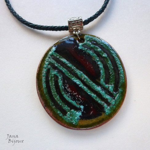 c743 20/05/2012VENDIDOS ( Prodáno)Jana Bijoux Colar curto com couro e cerâmica, comprimento 45 cm, medalhão tem formato oval e tem 6 cm de altura e 5,2 de largura R$ 20,00. KRÁTKÝ NÁHRDELNÍK Z VELKÉ KERAMIKY A KŮŽE.