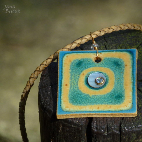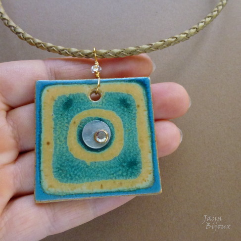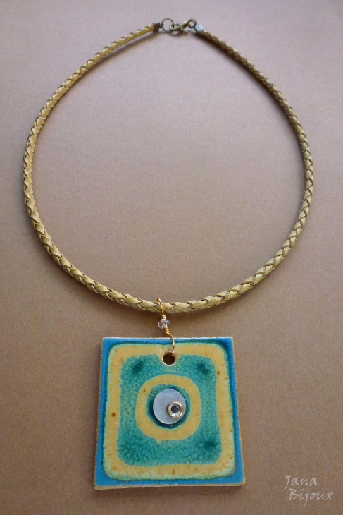 c791 11/11/2012VENDIDOS ( Prodáno)Jana Bijoux Colar curto 45cm de couro e cerâmica (4,5 cm) com a colagem R$ 29,00 KŮŽE, KERAMIKA A KOLÁŽ.