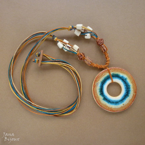 Dlouhý náhrdleník s keramickou mandalou, semínky, dřevem, uzly a měděnými motanými korálky.