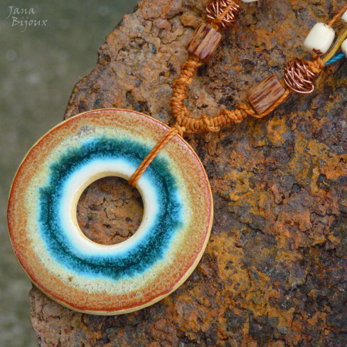 Mandala má 5,7 cm, vnitřní otvor 2 cm a má na sobě krásnou glazuru s netypickou kombinací barev. Rezavé, tmavé tyrkysové, béžové tak trochu do světle žluta.