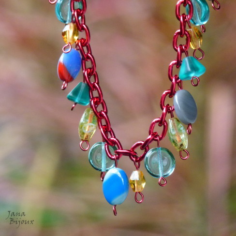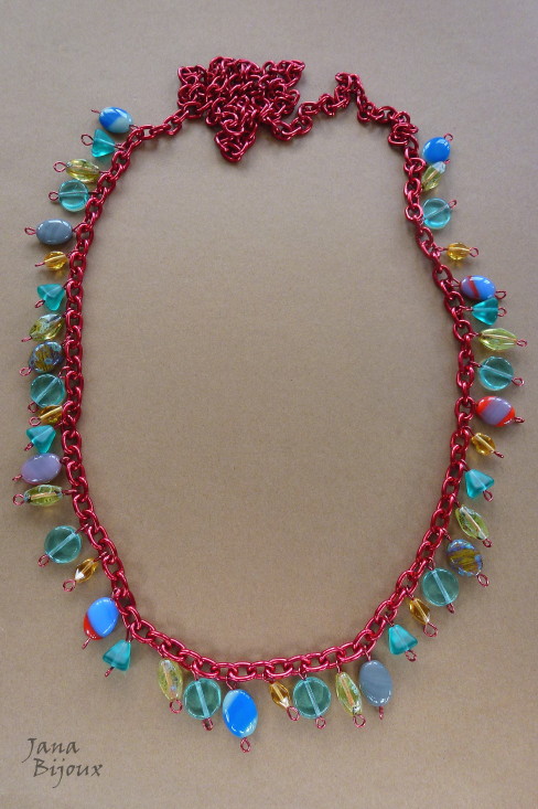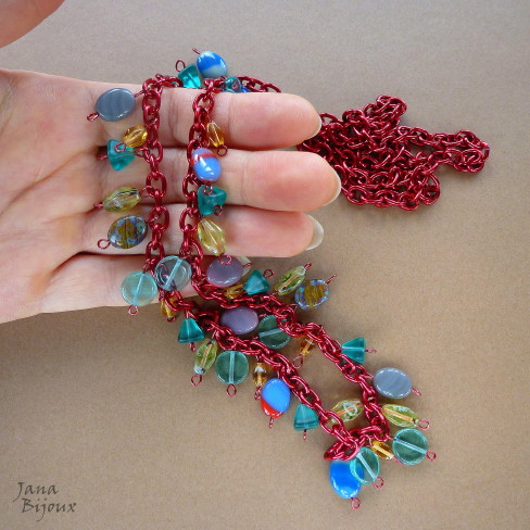 HLINÍKOVÝ ČERVENÝ ŘETĚZ S KOVODÍLY VE STEJNÉ BARVĚ A SKLO, DÉLKA 90 CM.
