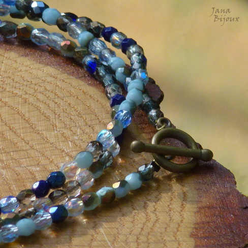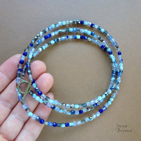 c882 07/07/2013VENDIDOS ( Prodáno)Jana Bijoux Colar comprido 86 cm de cristais com brilho de tons frios azuis. chumbo, azul claro e fecho americano em T ouro velho R$ 36,00.