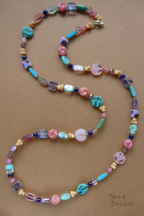 Colar comprido 90 cm, alegre, de vidros e cristais com acabamento banhado à prata..  formatos assimétricos R$ 45,00