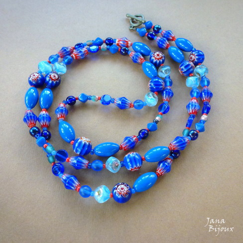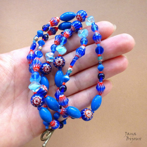 Colar comprido 89 cm com vidros azuis e millefiori. Acabamento em forma de T – fecho americano em ouro velho R$ 52,00