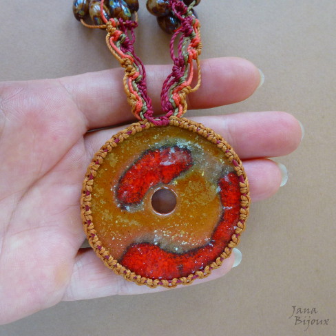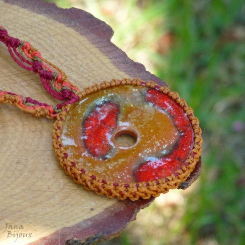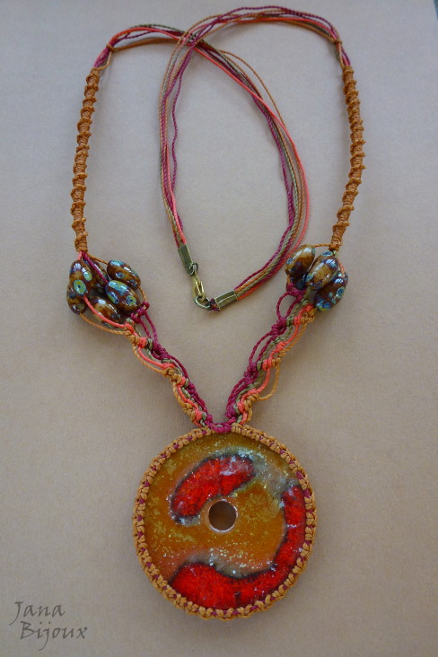 c931 09/02/2014VENDIDOS ( Prodáno)Jana Bijoux Colar comprido em cor mostarda, cerâmica 5cm e macramé. Acabamento em ouro velho R$ 35,00