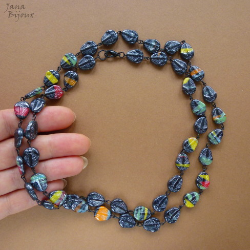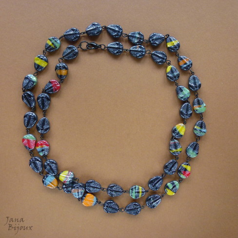 Colar comprido 91 cm de vidro metálico com listras coloridas, acabamento zinco preto. R$ 38,00