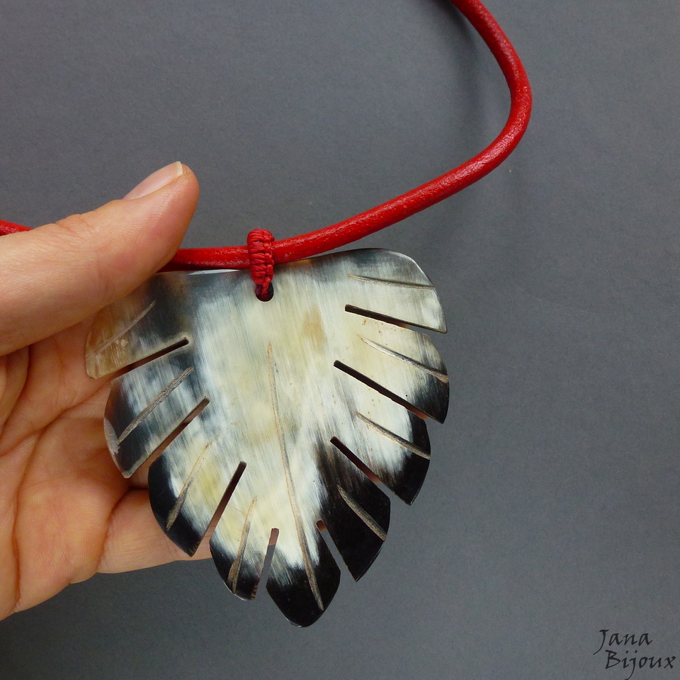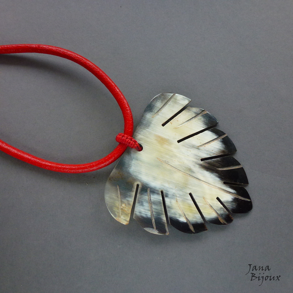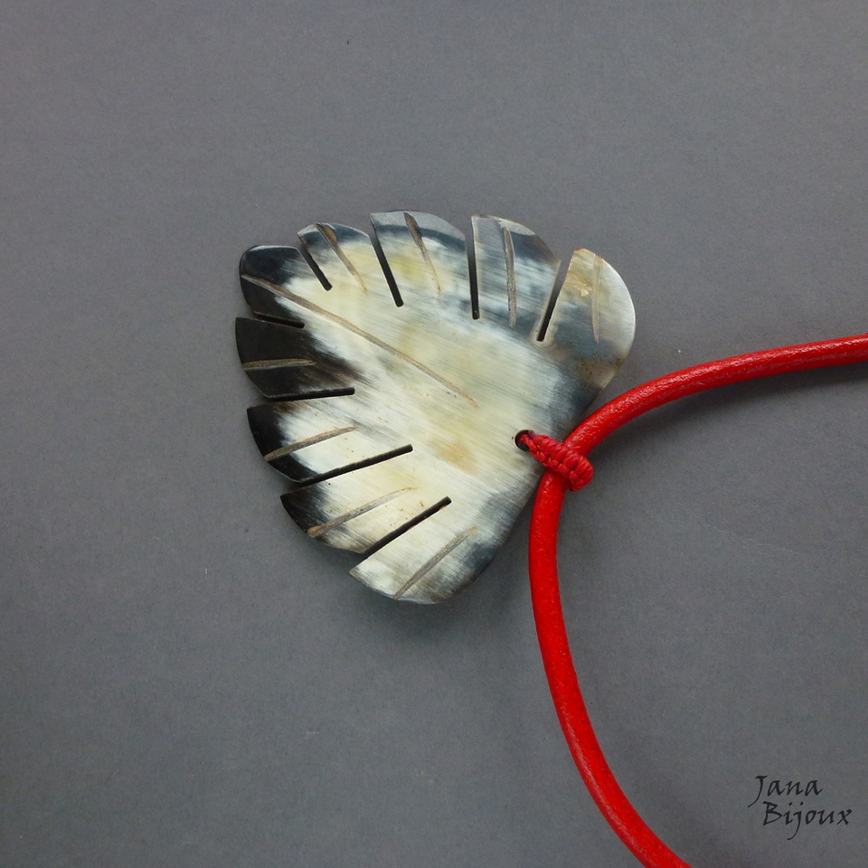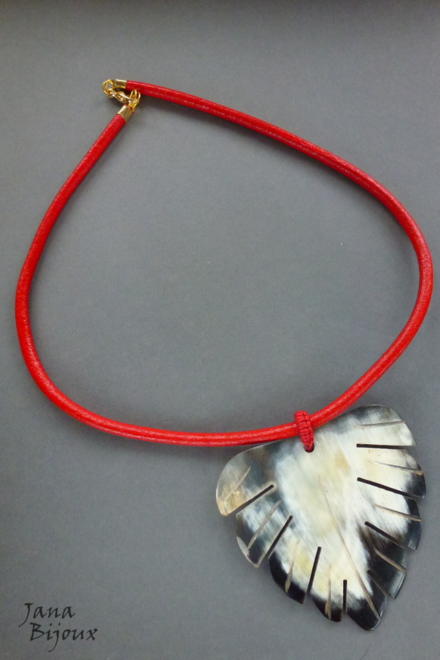 Colar médio 52,5 cm, com couro luxoso, vermelho, macio, importado.. com maxi folha de chifre 8 cm e alça feita a mão de macramé-fio vermelho. Acabamento dourado R$ 42,00 SUPER PEÇA ÚNICA