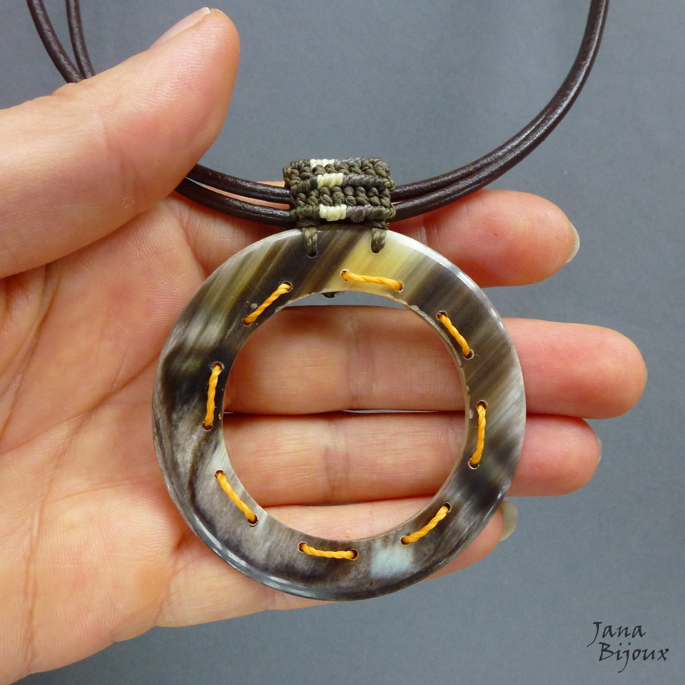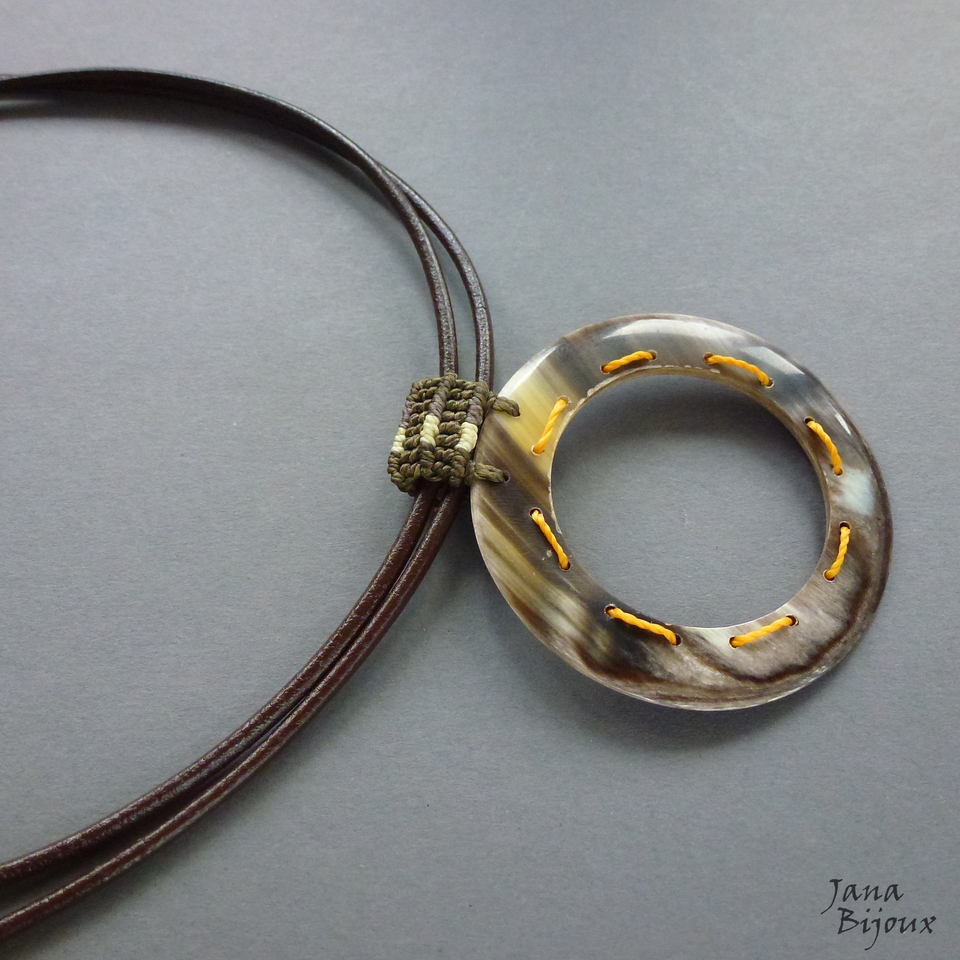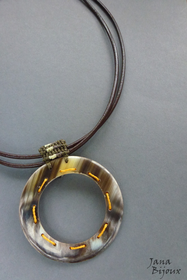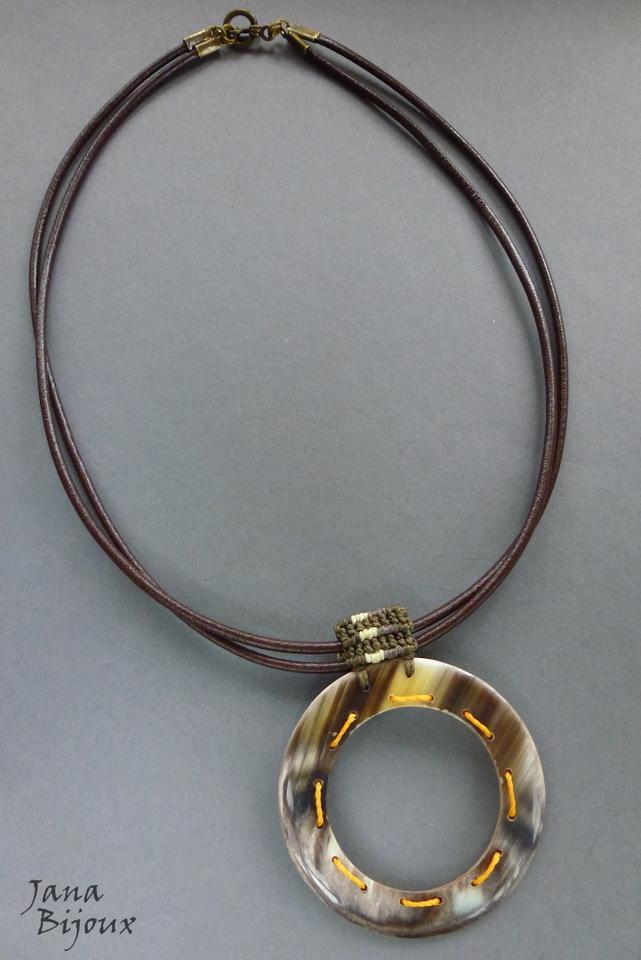 Colar médio 52,5 cm, com couro duplo de cor marrom café, com argola de chifre 6 cm e alça feita a mão de macramé mesclado. Acabamento ouro velho fecho americano em formato de T. R$ 36,00