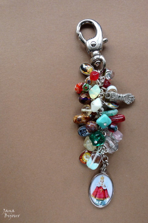 Chaveiro colorido 16/04/2012VENDIDOS ( Prodáno)Jana Bijoux Chaveiro colorido com 4 medalhas de santos, Menino Jesus de Praga, millefiori, vidro, cristal, figa, comprimento 12,2 cm. BAREVNÁ KLÍČENKA SE SKLEM A SVATÝMI.