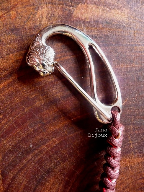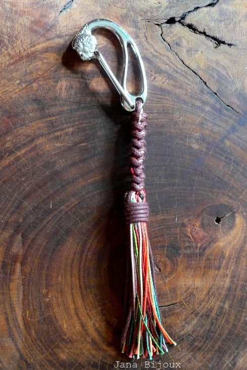 Chaveiro para pendurar na bolsa, com mosquetão atípico (com cabeça de leão), macramé e pompom de fios coloridos R$ 18,00.