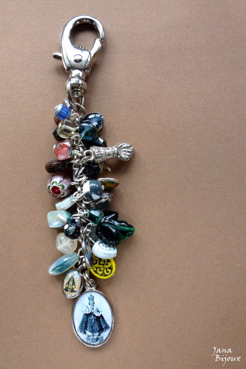 Chaveiro neutro 2 31/10/2011VENDIDOS ( Prodáno)Jana Bijoux Chaveiro neutro com 4 medalhas com santos, Menino Jesus de Praga em preto-branco, millefiori, vidro, cristal, figa, comprimento 12,5 cm. BAREVNÁ KLÍČENKA SE SKLEM A SVATÝMI