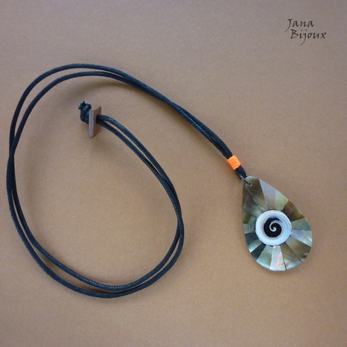 Colar comprido 70 cm, minimalístico com gota-mosaico (4,7 cm) de madrepérola e fio importado preto. Colar sem metal (só argolinha que segura medalhão), pode ser usado junto com estes brincos