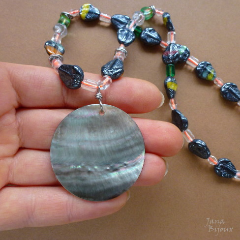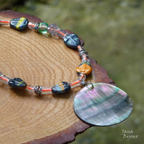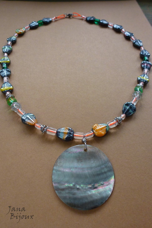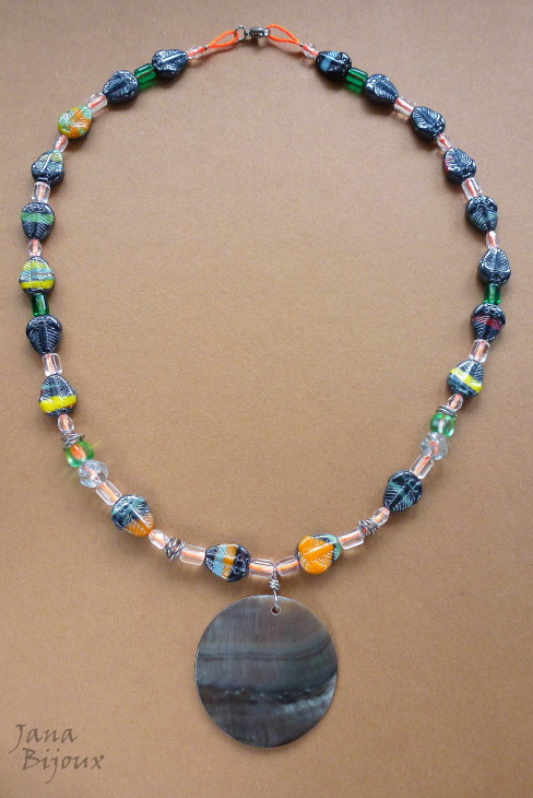 Colar médio 51 cm, de lindo medalhão de tamanho médio tmb de margaritifera (4 cm), aço cirúrgico e vidro transparente que revela fio neon que usei para fazer ele e vidros metálicos com manchas de amarelo, verde, laranja.. 4 peças artesanais feitas na mão de arames de inox grosso e fecho de aço tmb. Antialérgico, jovial, descolado e chique R$ 33,00.