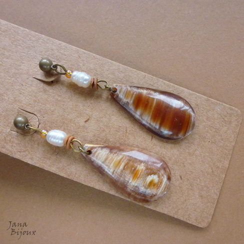 mc116 17/08/2014VENDIDOS ( Prodáno)Jana Bijoux Brincos compridos de 5,5 cm com pérolas e chifres, morototó e miçanga dourada. Fecho com tarracha, ouro velho R$ 23,00 Chifres lindos, listrados com tons de mel, ambar e branco.